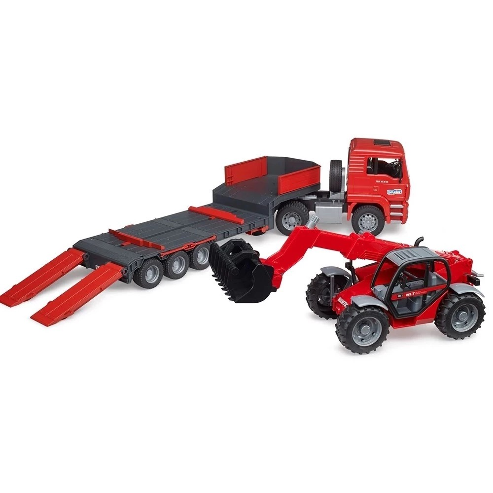 Trailer dengan muatan rendah sering kali digunakan untuk melakukan tugas pengangkutan berat, seperti mengangkut mesin konstruksi besar dari lokasi konstruksi ke lokasi konstruksi. Dalam dunia tema Konstruksi BRUDER, low loader MAN TGA mengangkut Manitou MT633 ke lokasi penempatan berikutnya. Kendaraan yang mengesankan ini memiliki fitur-fitur yang familiar dari low loader MAN, seperti kopling meja putar yang berfungsi penuh pada semitrailer, penyangga lipat, dan jalur akses yang dapat dipindahkan. Pengendali teleskopik yang dapat dikemudikan yang disertakan memiliki lengan teleskopik yang dapat dipanjangkan dan disesuaikan ketinggiannya serta sekop yang dapat dilepas.
