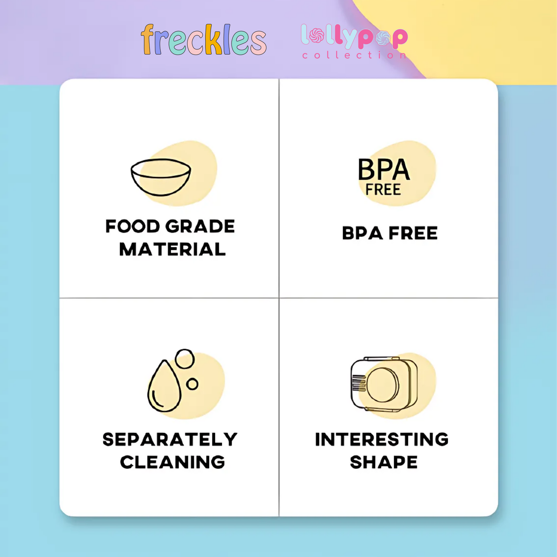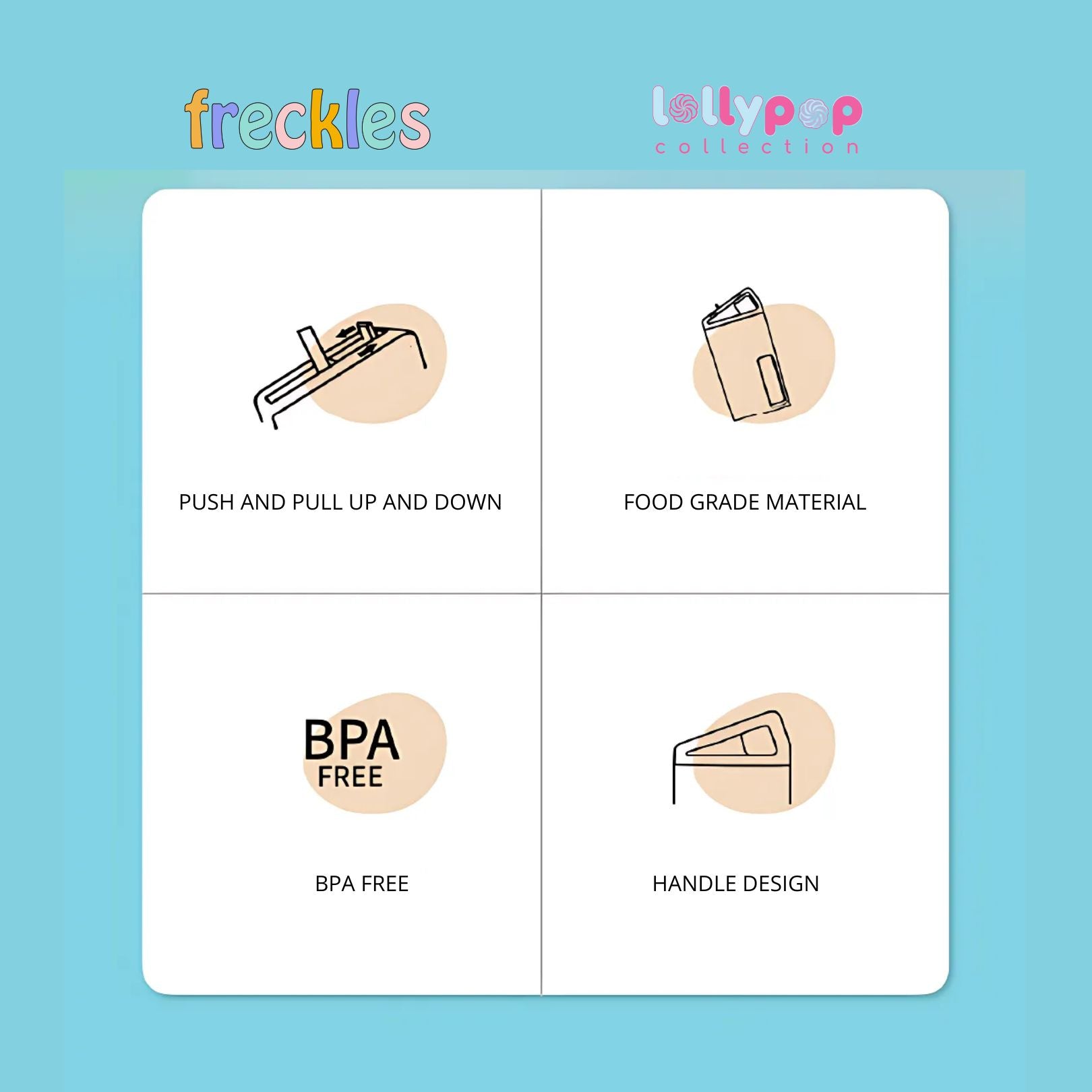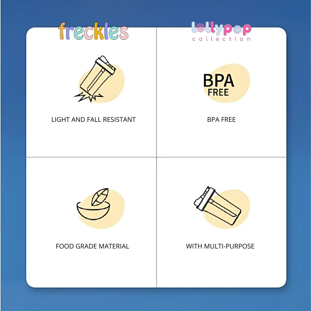 Freckles Lollypop Collection adalah koleksi botol dan tempat makan Freckles yg memiliki design dan warna pastel cute seperti lollypop yg siap menemani hari si kecil lebih berwarna. Berbahan Tritan dibuat dengan bahan berkualitas tinggi, BPA Free, tidak berbau, tahan lama dan tidak mudah pecah yang aman di gunakan si kecil beraktifitas.