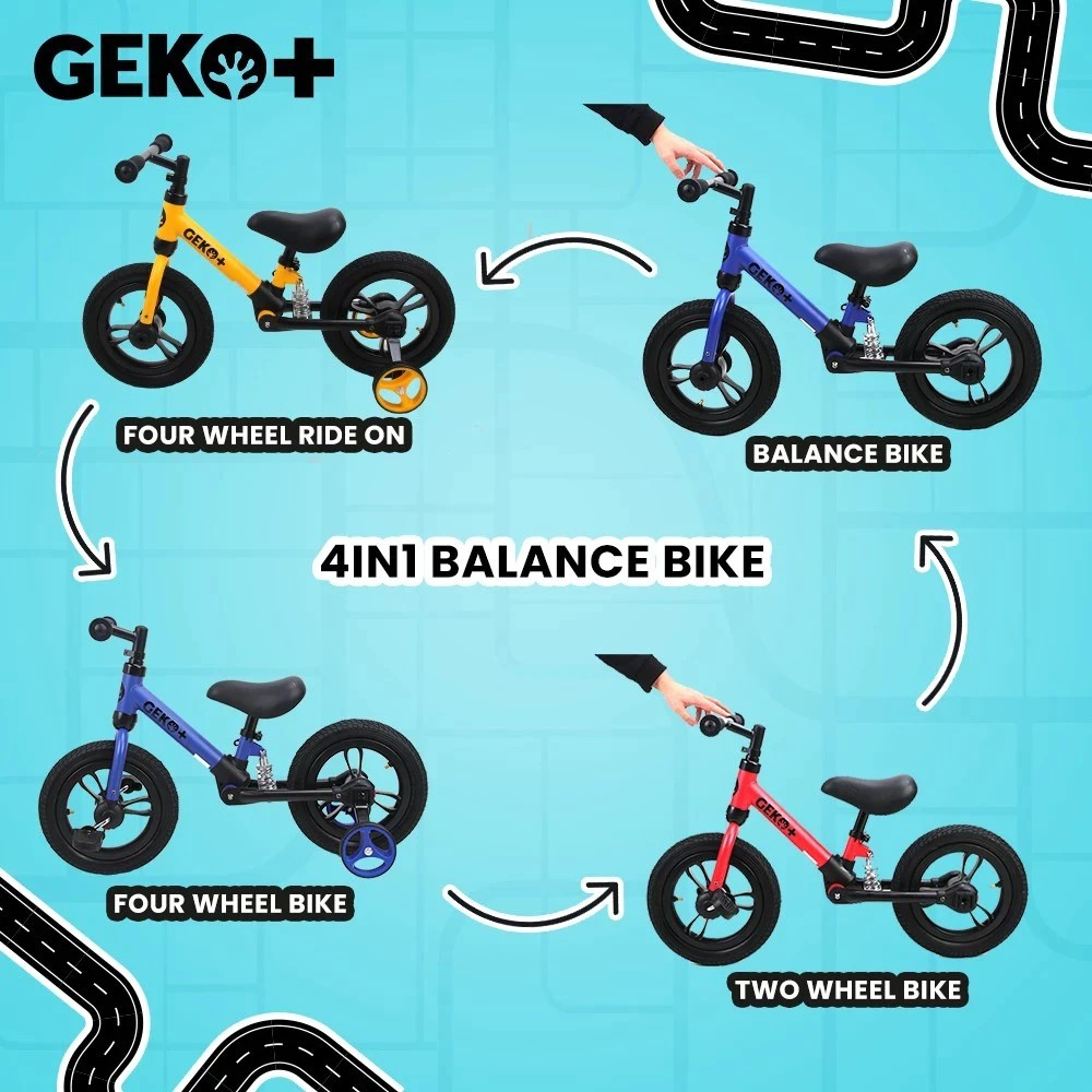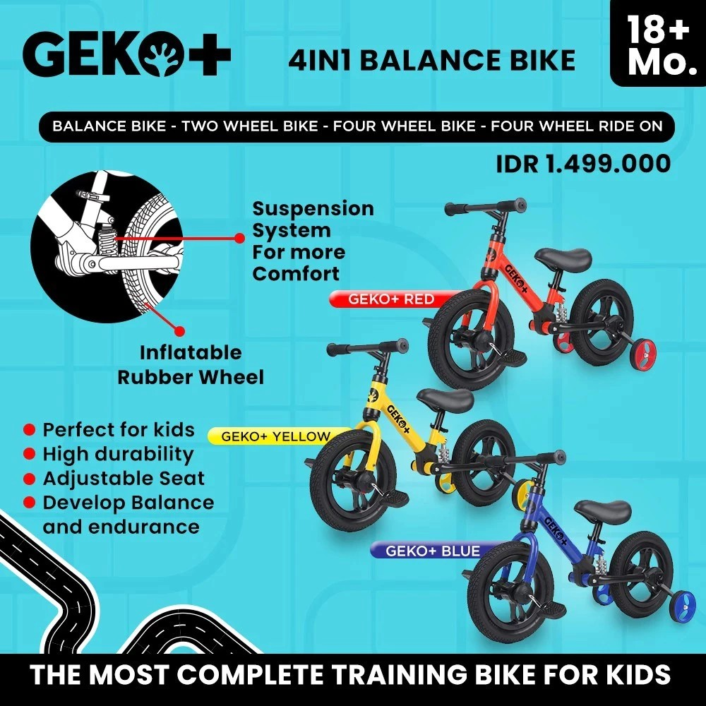 Geko Plus 4in1 Bike sangat mendukung perkembangan belajar anak dan tumbuh kembang anak, melatih keseimbangan, melatih anak mengayuh pedal, dan melatih keberanian pada anak. Geko Plus 4in1 Bike merupakan salah satu sepeda anak yang memiliki SISTEM SUSPENSI TERBAIK sehingga membuat anak merasa nyaman ketika bersepeda di jalan yang tidak datar, serta mendukung keseimbangan dalam bersepeda. Roda pada Geko plus terbuat dari High Quality Rubber dan dapat dipompa.