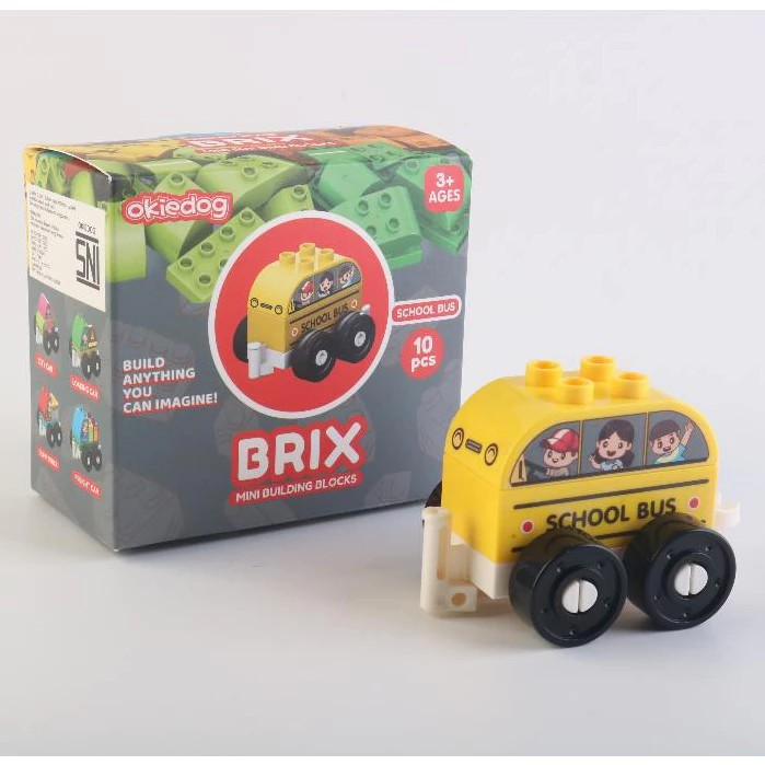 Okiedog BRIX merupakan mainan bongkar pasang untuk anak 3 tahun ke atas yang wajib dimiliki semua koleksinya. Okiedog BRIX hadir untuk si kecil dengan tujuan untuk mengenalkan anak pada macam-macam kendaraan dan susunannya. Si kecil diajarkan keterampilan untuk merakit suatu bentuk. Roda pada kendaraan Okiedog Brix dapat digerakkan dan rangkaian Okiedog Brix dapat disambung satu sama lain sehingga membentuk seperti kereta.