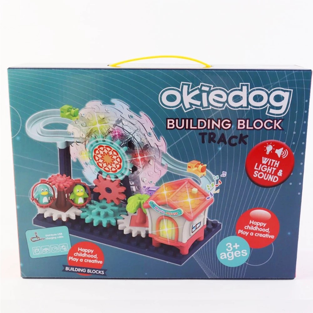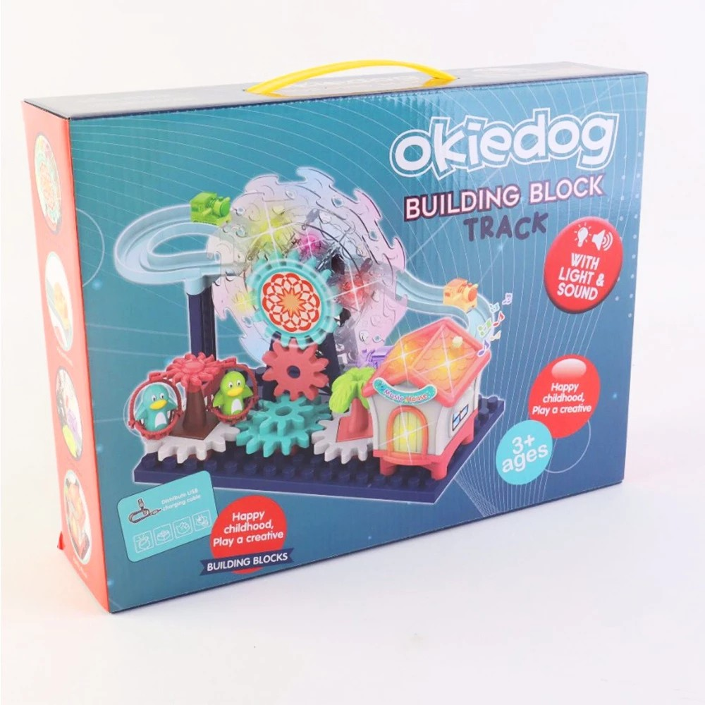 Okiedog ferris wheel paradise with light and music merupakan mainan anak yang dapat disusun dan bergerak dengan lampu dan musik. Membantu si kecil untuk belajar keterampilan menyusun bentuk dan membuatnya menjadi suatu kesatuan. Terdiri dari Biang lala, aksesoris rumah dan pohon, dan aksesoris pendukung.